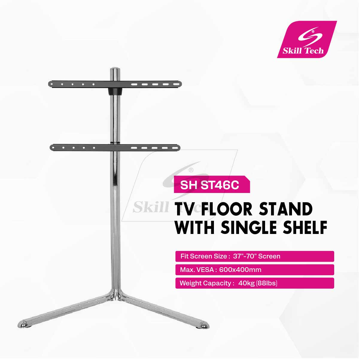 The SH ST46C Chrome Plated Slender V-Base Studio TV Floor Stand is a premium display solution for 49″–70″ screens. Featuring a sleek chrome finish, it supports up to 40kg with a 600×400mm VESA mount. Its 360° rotation, cable management, and direction indicators offer style and functionality. Made from aluminum, steel, and plastic, it includes a compartment polybag accessory kit for organized, easy assembly.