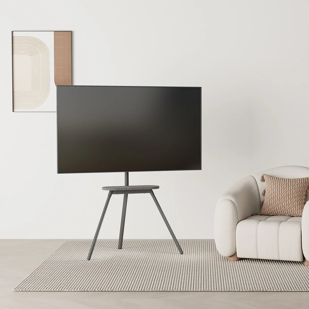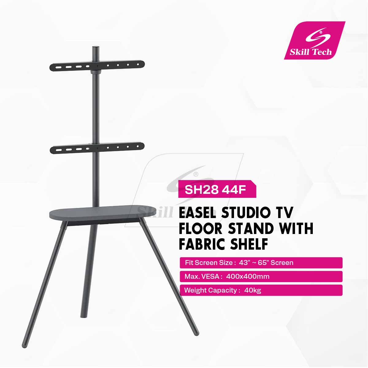 The SH28 44F Easel Studio TV Floor Stand combines modern aesthetics with functionality. Designed for 43"–65" TVs, it supports up to 40kg and features a 70° swivel range, cable management, and anti-tip straps for safety. Crafted from steel, aluminum, and fabric, with a matte white or space grey finish, it includes a stylish fabric shelf (10kg capacity) and solid wood accents—perfect for contemporary living or creative spaces.