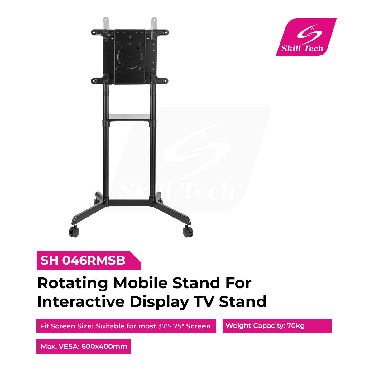 The SH 046RMSB Rotating Mobile Stand is a versatile solution for interactive displays, designed for ease of use and mobility. Constructed from durable cold-rolled metal sheets with a matte black finish, it supports most 37"~75" screens up to 70kg. Featuring tilt 0° ~ -5°, rotation 0° ~ -90°, and a 5kg shelf capacity, it ensures functionality and convenience. Equipped with casters for mobility, integrated cable management, and a direction indicator, it provides a stable, organized, and flexible interactive display setup.