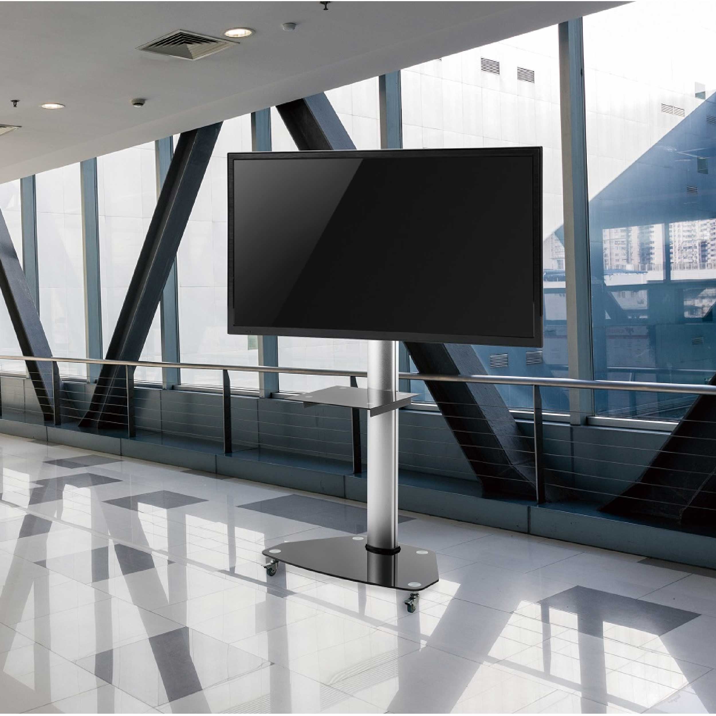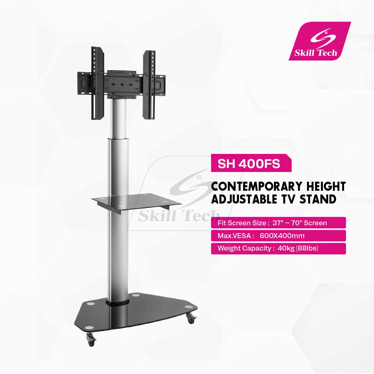The SH 400FS is a contemporary height-adjustable TV stand designed for 37″ to 70″ screens, with a weight capacity of 40kg. It features a sleek design combining tempered glass, steel, aluminum, and plastic, with a black silk-screen finish and anodized aluminum frame. Offering +5° to -12° tilt and 180° screen rotation, it includes a height-adjustable shelf (5kg capacity), cable management, caster base, and has passed strength and slope tests for stability.