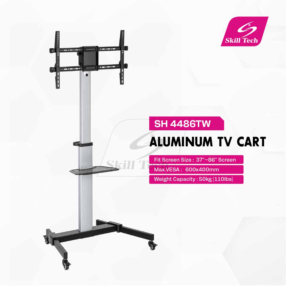 The SH 4486TW is a cost-effective aluminum TV cart crafted from aluminum, steel, and plastic with fine texture grey and matte black or white finishes. Suitable for most 37"–86" screens (max. VESA 600×400mm), it supports up to 50kg (110lbs) and is strength tested four times. Features include +5° to -10° tilt, 0°–+90° screen rotation, adjustable TV and shelf height, and integrated cable management for a neat setup.
