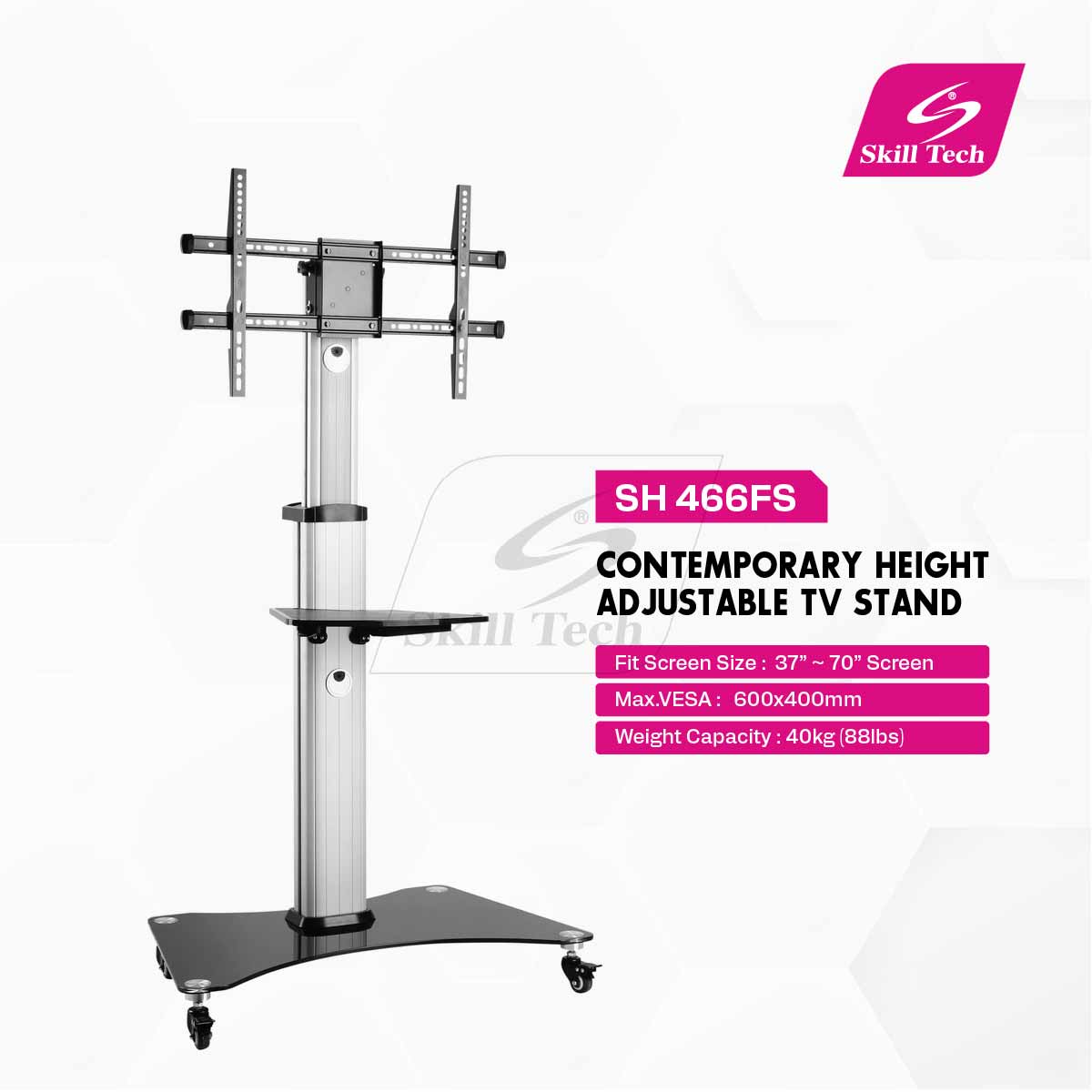 The SH 466FS is a contemporary height-adjustable TV stand designed for most 37″ to 70″ screens. Made from tempered glass, aluminum, steel, and plastic, it features a sleek matte black finish with black silk-screened glass. Supporting up to 40kg, it offers tilt (+5° ~ -12°) and screen rotation (0° ~ -90°) for portrait or landscape viewing. Adjustable shelf, cable management, and caster wheels ensure functionality, mobility, and a clean, modern setup.