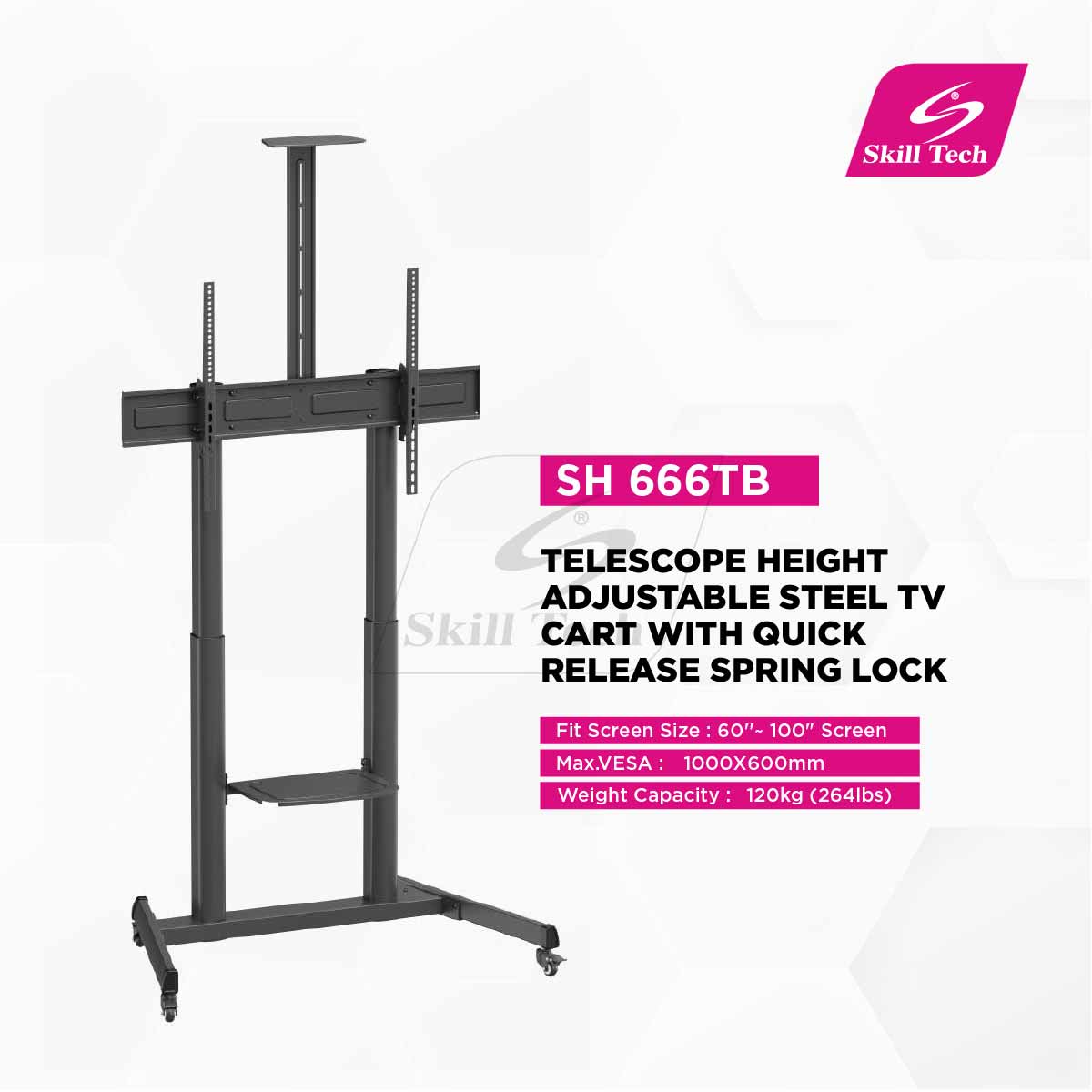 The SH 666TB is a sturdy, height-adjustable TV cart designed for large screens ranging from 60″~100″, with a maximum weight capacity of 120kg. Made of steel and plastic with a matte black powder-coated finish, it features telescopic height adjustment (450mm), a tilt range of +5°~-10°, and durable caster wheels for mobility. Includes adjustable shelf and camera rack (5kg each), has passed strength and 10° slope tests, and comes with an instruction manual.
