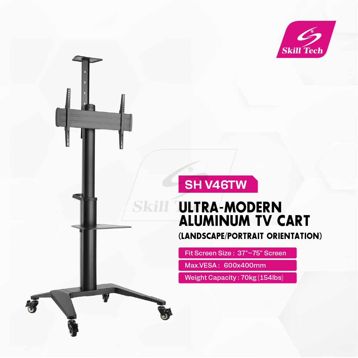 The SH V46TW Ultra-Modern Aluminum TV Cart offers premium flexibility and style, supporting most 37"–70" screens up to 70kg. Its landscape/portrait screen rotation (0°+90°) and +5°-12° tilt provide versatile viewing angles. Height-adjustable from 1250mm to 1600mm (49.2"–63"), it features adjustable shelves, integrated cable management, and a sturdy aluminum, steel, and plastic build. Finished in Matte Black or Gloss White, this sleek cart is strength-tested and perfect for professional or modern spaces.