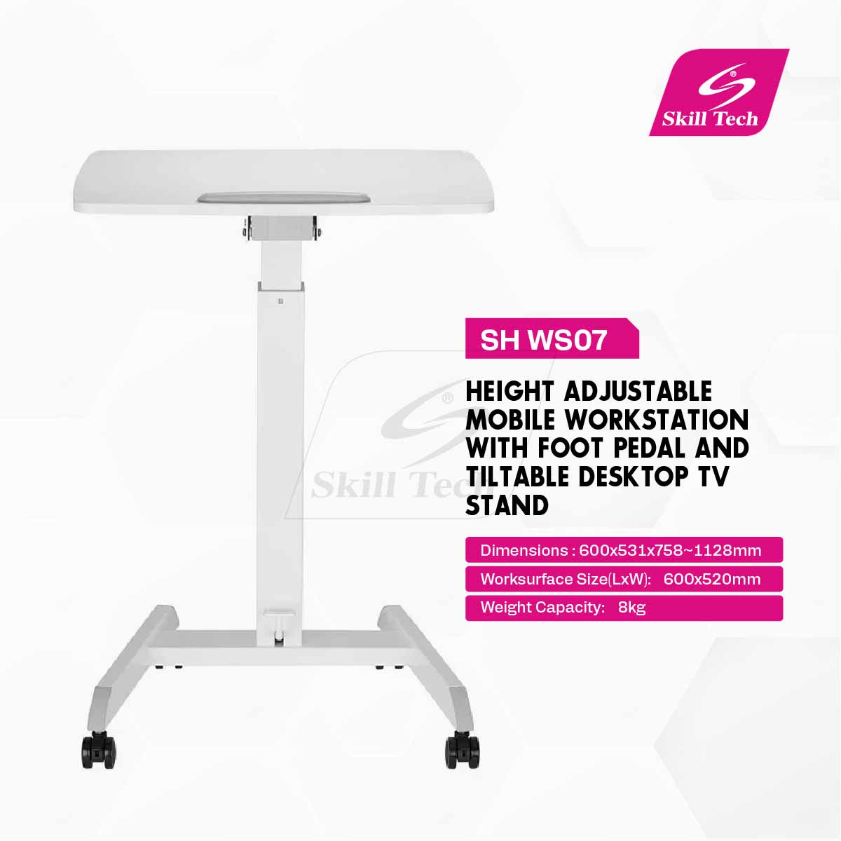 The SH WS07 is a height-adjustable mobile workstation designed for flexibility and comfort. With a manual foot pedal adjustment, it offers a height range of 758–1128mm and a tiltable desktop with four angle settings (0°, 10°, 20°, 30°). Made from plastic, steel, aluminum, and melamine-coated particle board, it supports up to 8kg. Its compact design, smooth-rolling casters, and freestanding setup make it ideal for dynamic work environments.