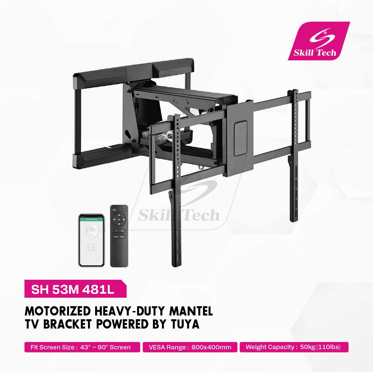 The SH 53M 481L is a premium motorized heavy-duty mantel TV mount designed for screens from 43″ to 90″. Powered by Tuya smart control, it supports up to 50kg and accommodates curved TVs with VESA compatibility up to 800x400mm. With a smooth swivel range of ±20° and extendable profile from 155mm to 520mm, it ensures optimal viewing. Built with durable materials, it also includes cable management and a detachable panel for clean installation.