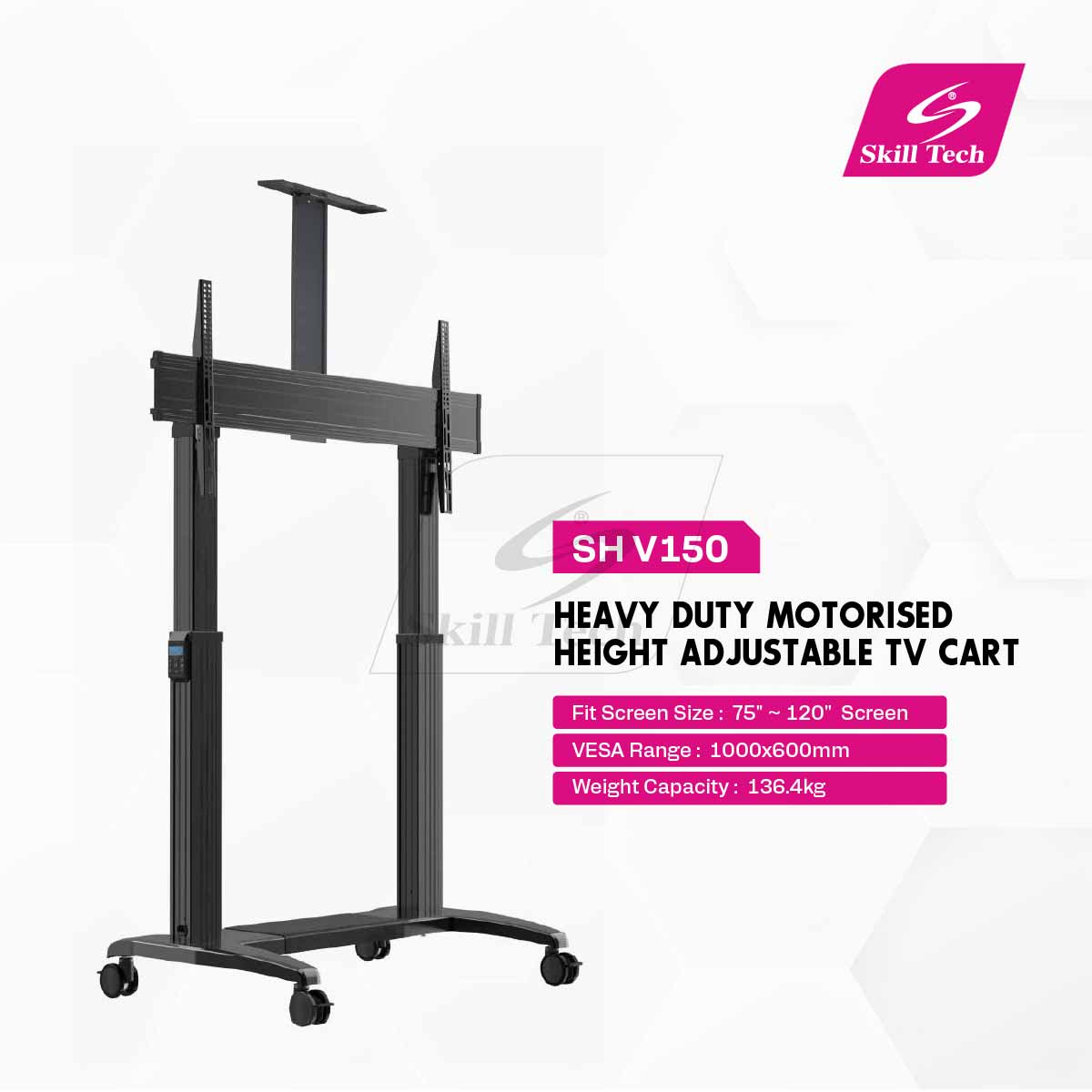 The SH V150 Heavy Duty Motorised Height Adjustable TV Cart is designed for 75" to 120" screens, supporting up to 136.4kg. Built with durable aluminum in a sleek black finish, it offers smooth motorised height adjustment from 1200mm to 1700mm with a 500mm upright range. Compatible with VESA sizes from 200x200mm to 1000x600mm, it’s ideal for professional settings. Backed by a 1-year warranty for peace of mind.