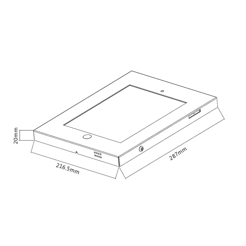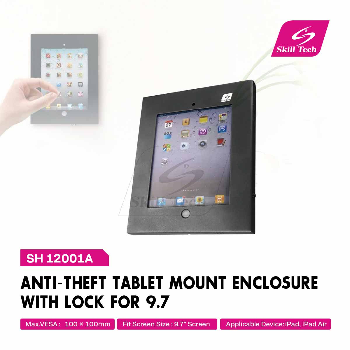The SH 12001A is a robust anti-theft tablet mount enclosure designed specifically for 9.7" iPads and iPad Air. Made from durable steel with a sleek powder-coated finish, it ensures secure wall installation with VESA 100x100mm compatibility. The enclosure features a locking mechanism for added security, making it ideal for public use. Integrated cable management keeps setups tidy, while the slim 20mm profile ensures a modern, low-profile display. Perfect for kiosks, showrooms, and retail environments.