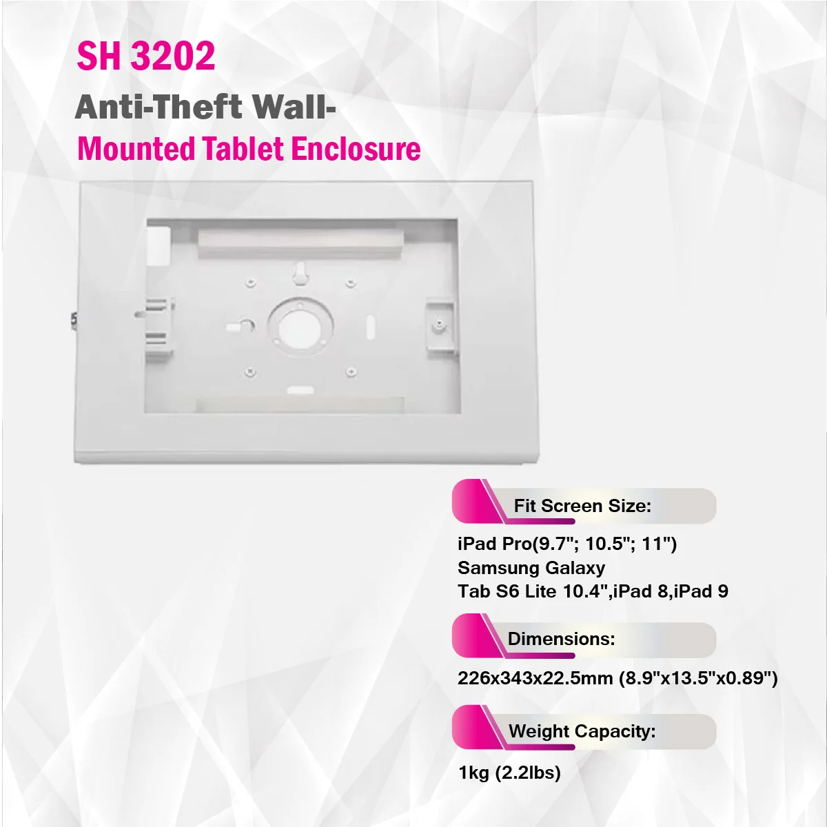 The SH 3202 Anti-Theft Tablet Mount Enclosure is a secure and versatile wall-mounted solution designed for commercial and public environments. Built with durable steel and plastic and finished with sleek powder coating, it supports a wide range of iPads and Samsung tablets from 9" to 11". With anti-theft locking, cable management, and a removable front panel, it ensures safety and convenience in retail, education, or corporate settings. Ideal for fixed tablet display needs.