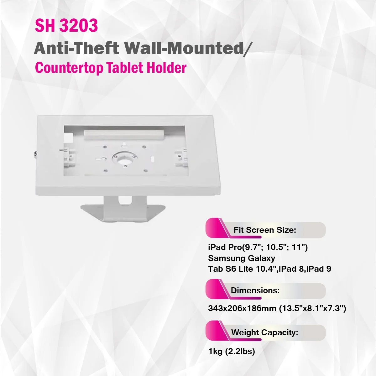 The SH 3203 Anti-Theft Tablet Holder is a versatile wall-mounted or countertop kiosk stand designed for secure public or commercial use. Compatible with a wide range of iPads and Samsung tablets (9.7"–11"), it features a durable steel and plastic build with a powder-coated matte finish. With 90° screen rotation, integrated cable management, and anti-theft locking, it ensures both functionality and protection. Ideal for interactive displays, check-ins, or retail environments.