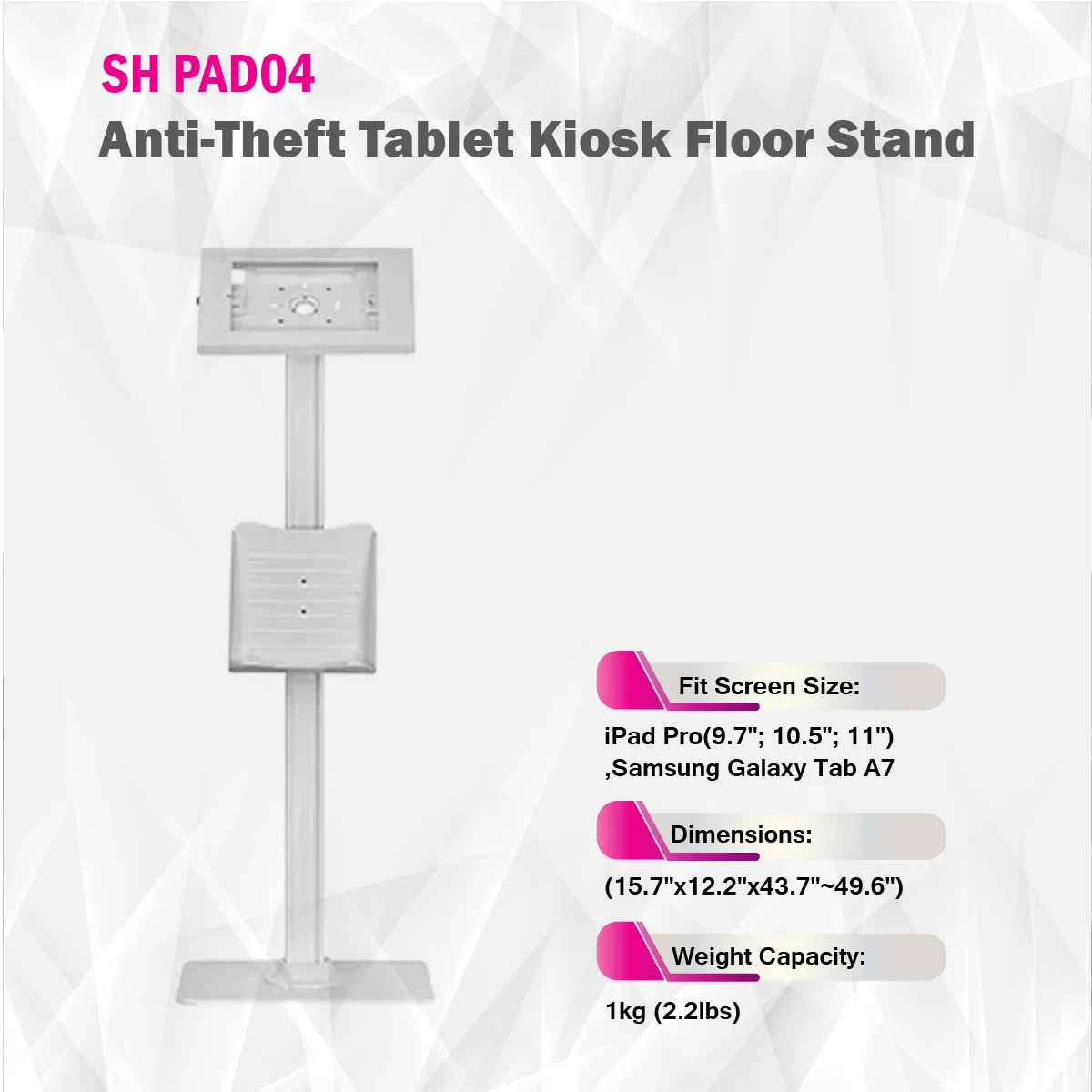 The SH PAD04 Anti-Theft Kiosk Tablet Stand is a secure and versatile floor mount solution, ideal for public spaces. Designed to support various iPad and Samsung Galaxy Tab models, it features adjustable height and offers smooth tilt and rotation for optimal viewing. Built with durable steel and aluminum, it ensures device protection with an anti-theft locking system and integrated cable management, making it perfect for exhibitions, retail, and interactive kiosks.