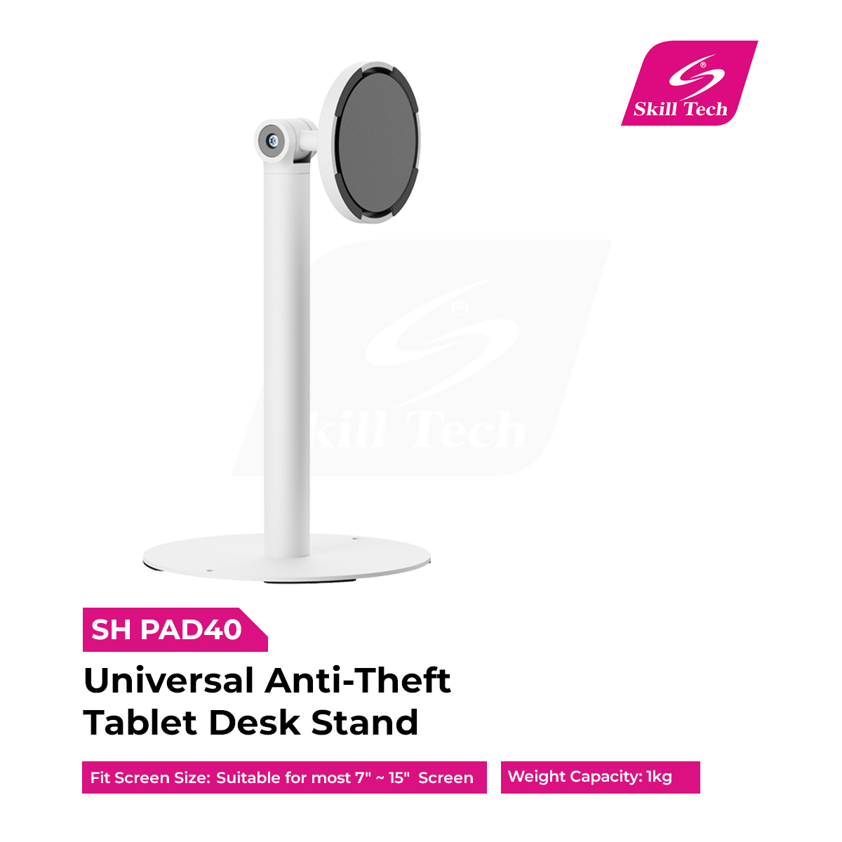 SH PAD40 Universal Anti-Theft Tablet Desk Stand is a secure and versatile mounting solution for tablets from 7”~15”. Constructed from durable aluminium, steel, and plastic with a matte white powder-coated finish, it delivers both stability and modern style. Featuring +205°~-25° tilt and full 360° swivel rotation, it ensures flexible viewing angles. The integrated anti-theft design makes it ideal for retail, commercial, and public environments.