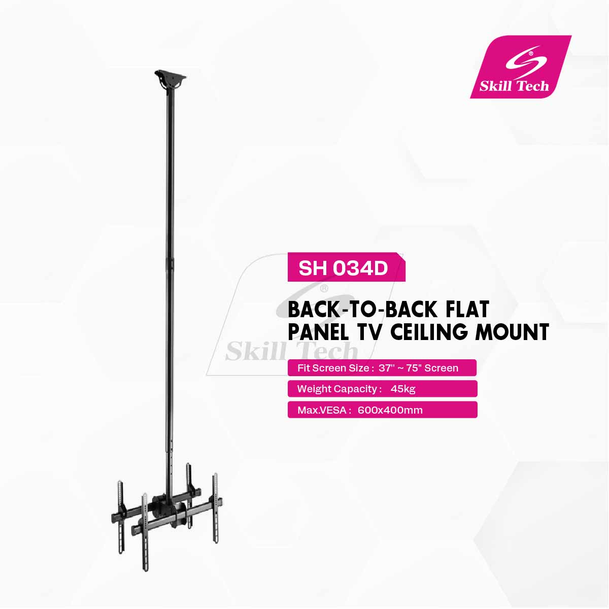 The SH 034D Back-to-Back Flat Panel TV Ceiling Mount is ideal for dual 37" to 75" TVs, including curved models. Made from durable steel with a matte black powder coating, it supports up to 45kg per screen. It features full 360° rotation, tilt (+5° to -20°), and swivel (+/-180°) functions. Height adjustable (2500–3000mm) with VESA compatibility up to 600x400mm and integrated cable management for a clean, professional setup.