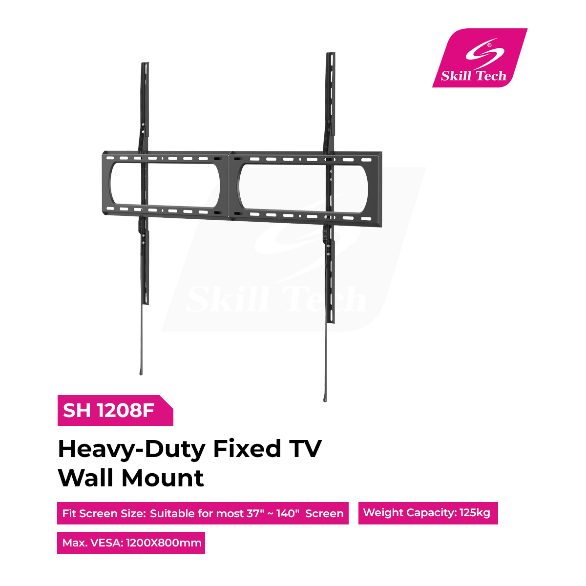 SH 1208F Heavy-Duty Fixed TV Wall Mount is designed for large 37”~140” flat and curved TVs. Constructed from solid steel with a matte black powder-coated finish, it supports up to 125kg for maximum strength and stability. The ultra-slim 32mm profile delivers a clean, low-profile look. Featuring universal VESA compatibility up to 1200x800mm, a detachable panel, and included hook-on bubble level, it ensures quick, precise, and secure installation.