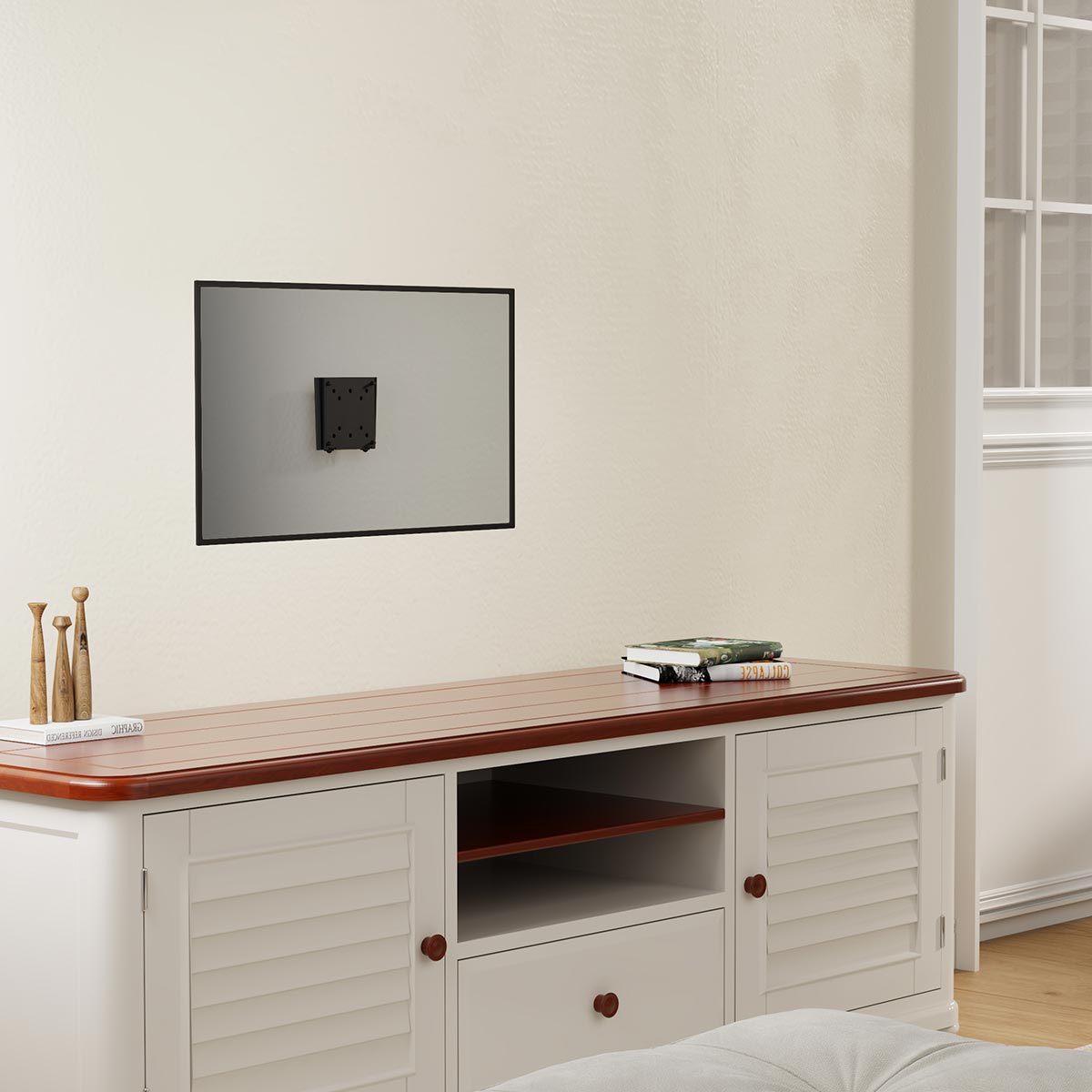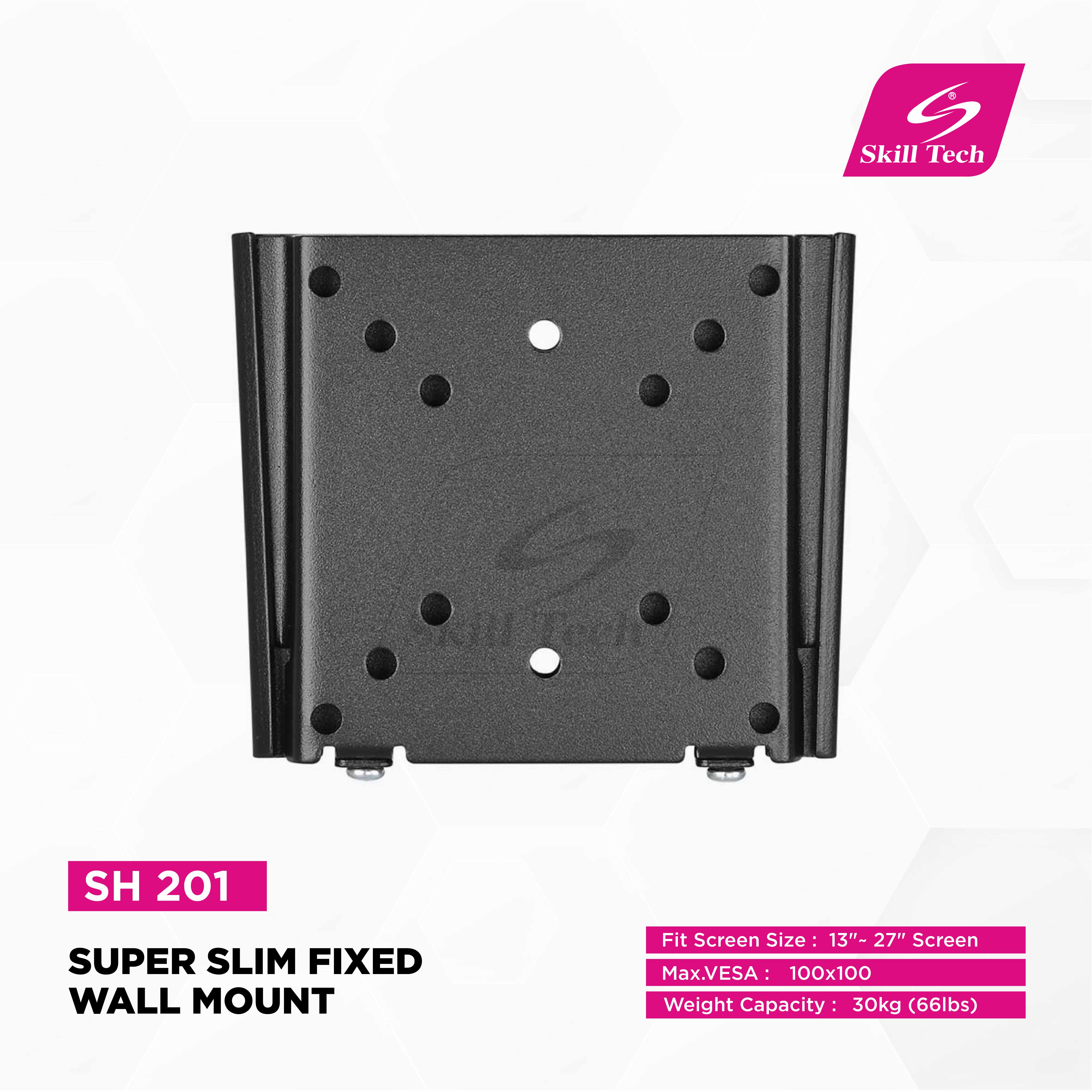 The SH 201 Super Slim Fixed Wall Mount is a compact and sturdy solution for mounting most 13"~27" screens. Made from durable steel with a fine texture black or gloss grey powder-coated finish, it supports up to 30 kg with VESA compatibility up to 100x100. With an ultra-slim 15 mm profile, it keeps the TV close to the wall for a sleek look. Easy to install on solid walls, it includes a detachable panel for convenience.
