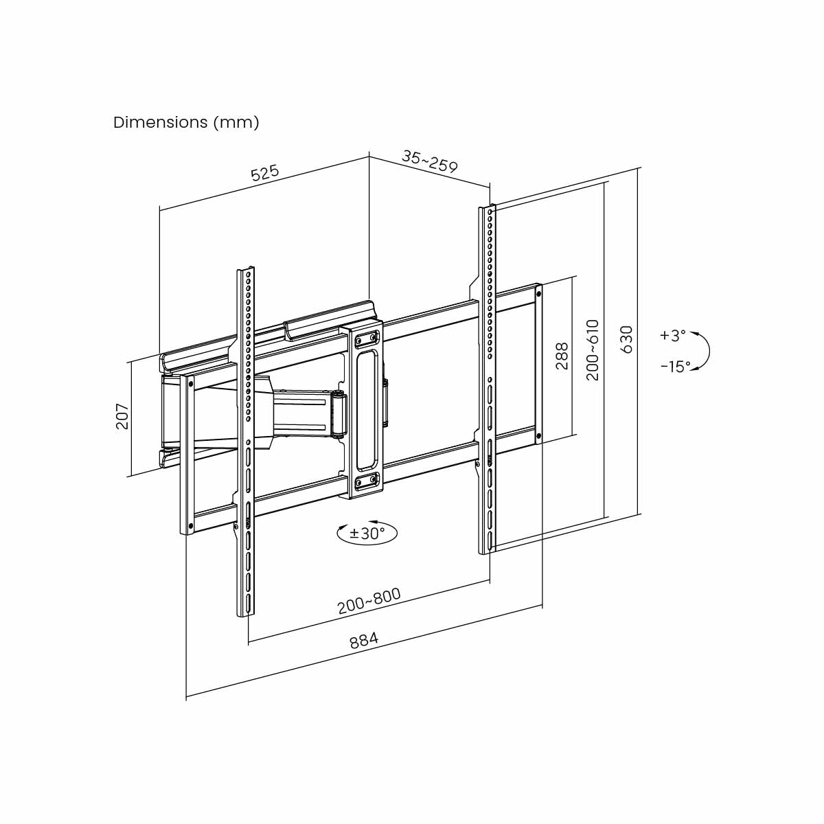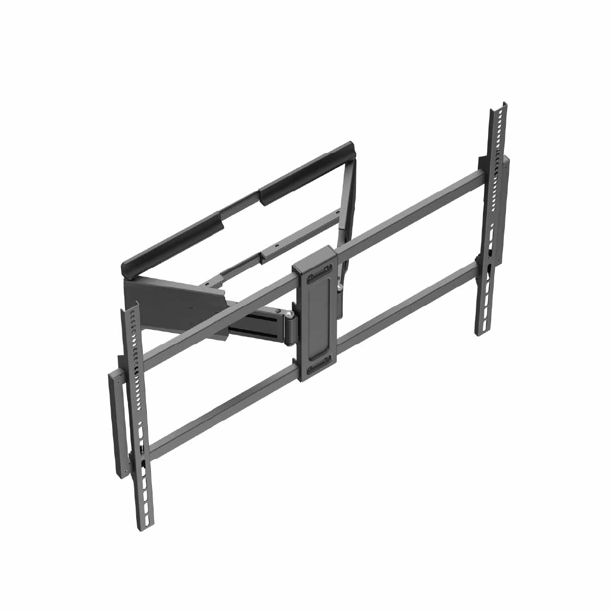 The SH 443P Ultra-Slim Heavy-Duty Full-Motion TV Mount is engineered for large 43″–100″ TVs, including curved models, supporting up to 65kg with strength tested at three times capacity. Its ultra-low 35mm profile expands to 259mm for smooth positioning with +3° ~–15° tilt and +30°~-30° swivel. The durable steel construction features a detachable panel, 800×600mm VESA compatibility, solid wall or double-stud installation, cable management, and a built-in bubble level for easy setup.