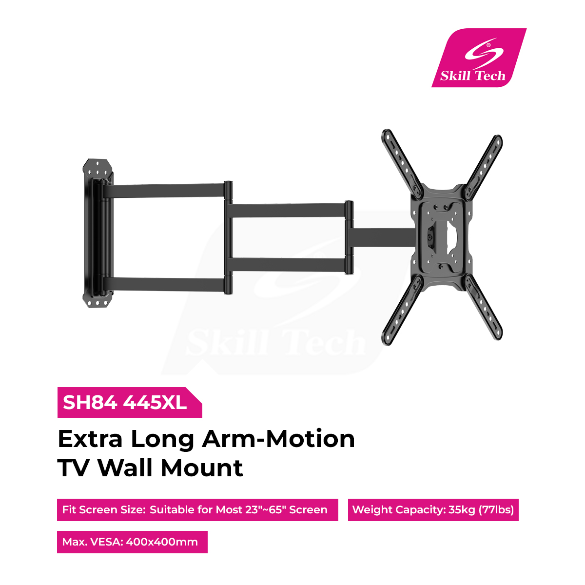 The SH84 445XL Extra Long Arm-Motion TV Wall Mount is designed for flexibility and stability, supporting most 23"~65" TVs up to 35kg. Its durable steel construction and powder-coated finish ensure long-lasting performance. With an extended reach of 946mm, it offers +5°~-15° tilt, +90°~-90° swivel, and +3°~-3° screen leveling. Compatible with VESA up to 400x400mm, it features cable management and installs easily on solid walls or single studs.