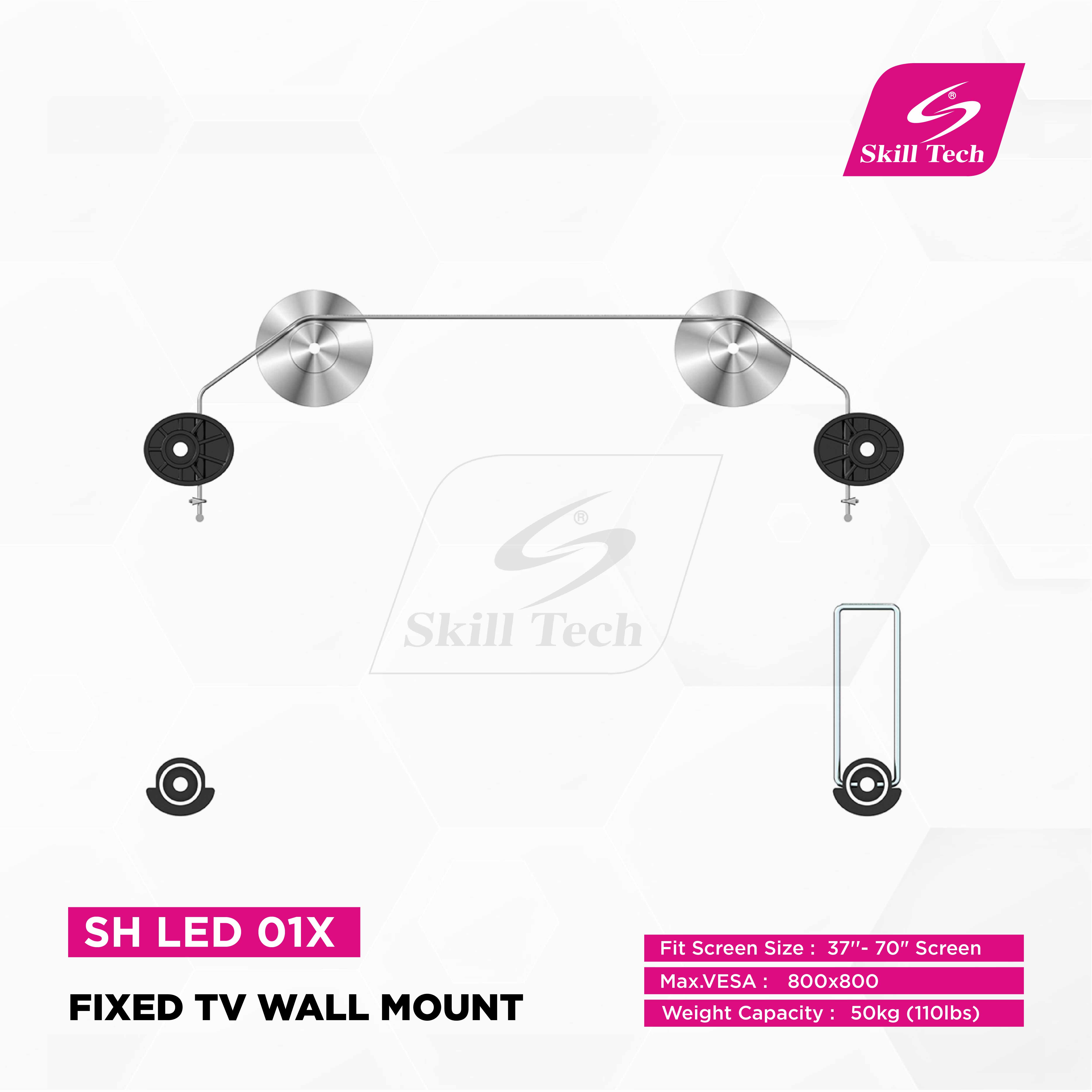 The SH LED 01X Fixed TV Wall Mount offers a sleek and durable solution for securely mounting TVs from 37" ~ 70". Built with aluminum, steel wire rope, and plastic, it features a slim 14.5mm profile with a brushed anodized aluminum finish in gloss grey. Supporting up to 50kg, it ensures universal VESA compatibility up to 800x800mm. Ideal for solid walls or double-stud installation with a detachable panel design.