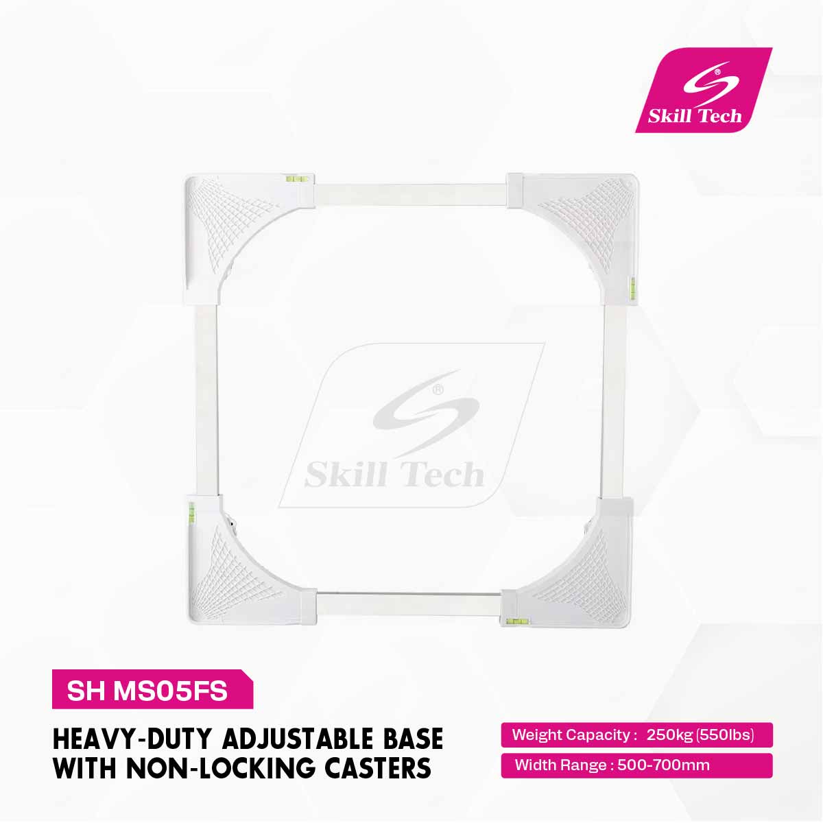 The SH MS05FS is a heavy-duty adjustable mobile base designed for washing machines and appliances. Made from durable stainless steel and plastic, it supports up to 250kg (550lbs). The width is adjustable from 500 to 700mm (19.7"–27.6"), making it versatile for various appliance sizes. Featuring non-locking casters for easy mobility and available in white and black, it's a practical solution for enhanced stability and convenience in home or commercial use.
