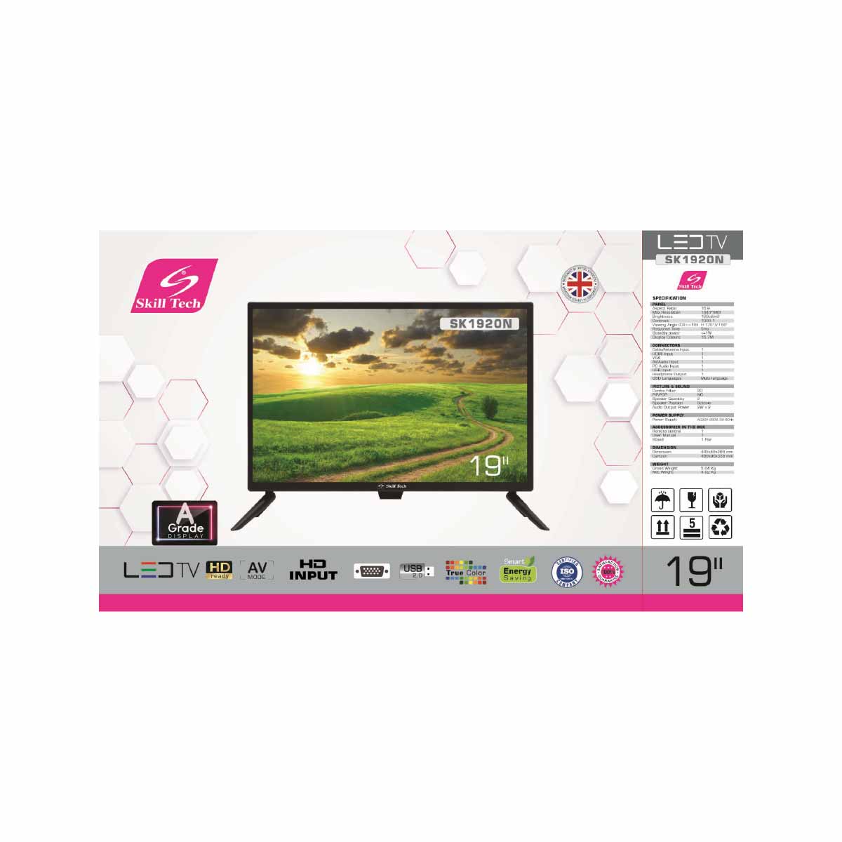 The Skill Tech SK1920N 19-Inch Normal TV is a compact and efficient entertainment solution, offering a 1440x960 resolution and 16:09 aspect ratio for crisp visuals. With a 5ms response time and 120cd/m² brightness, it ensures smooth and clear playback. It features HDMI, VGA, USB, and AV inputs, along with dual bottom speakers. Ideal for small rooms or personal use, it supports multi-language OSD and low power consumption.