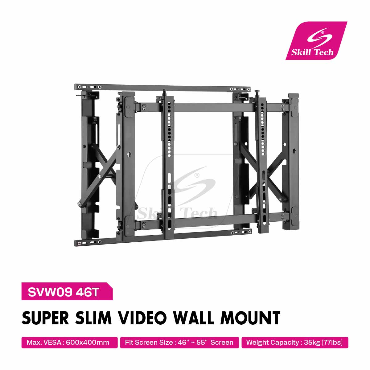 The SVW09 46T Super Slim Video Wall Mount is a standard-grade steel mount designed for 46"–55" screens, supporting up to 35kg per display. With a slim profile of just 49mm and extendable up to 223mm, it offers fine depth (5mm) and height (12mm) adjustments for clean, precise installation. Finished in matte black, it includes a direction indicator and Samsung TV screw kit, and is strength tested 4 times for dependable performance.